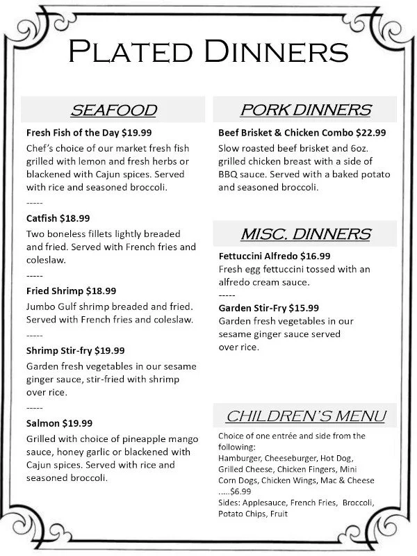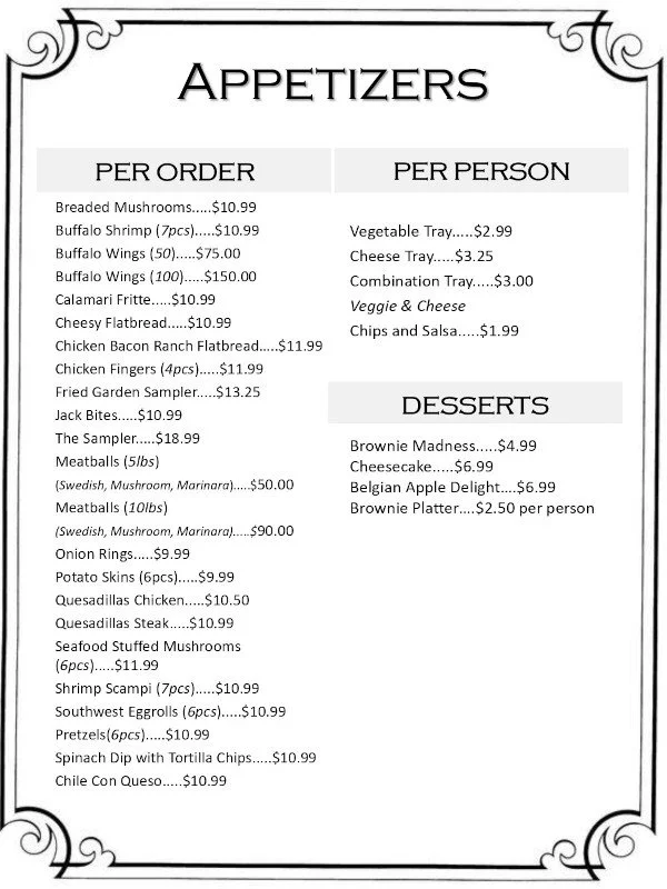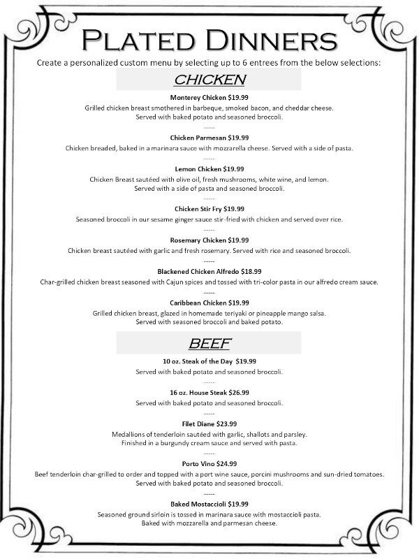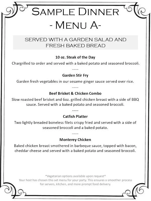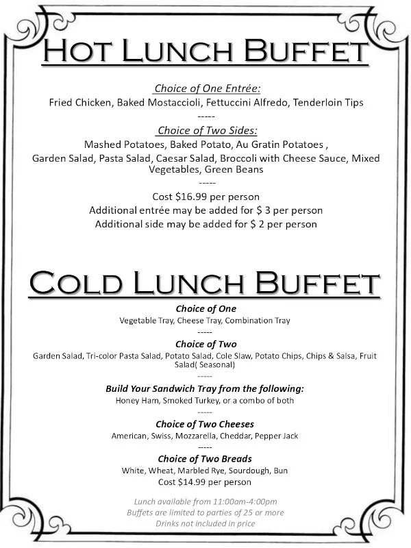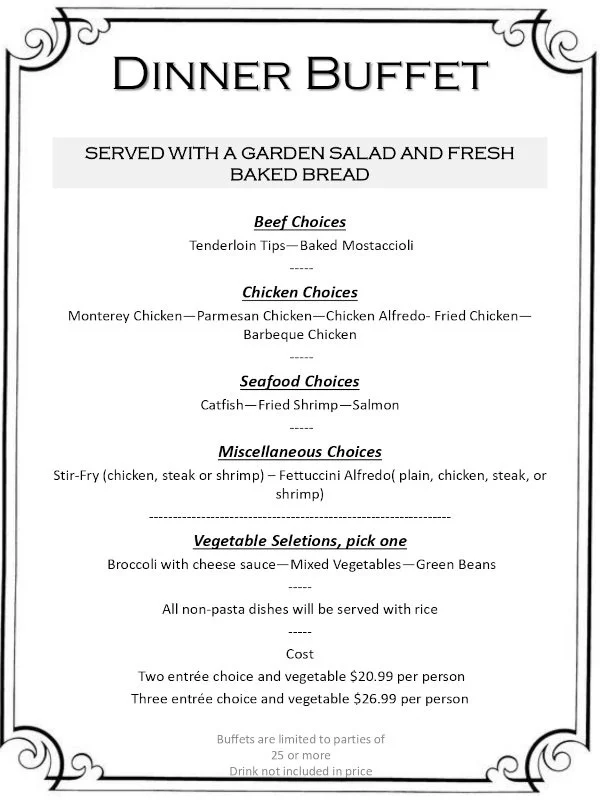 If an event is cancelled, the $100 deposit will be forfeited. Groups of 25 or more have the option of buffet style food, creating a limited menu with up to six items or using our in-house limited lunch or dinner menus.