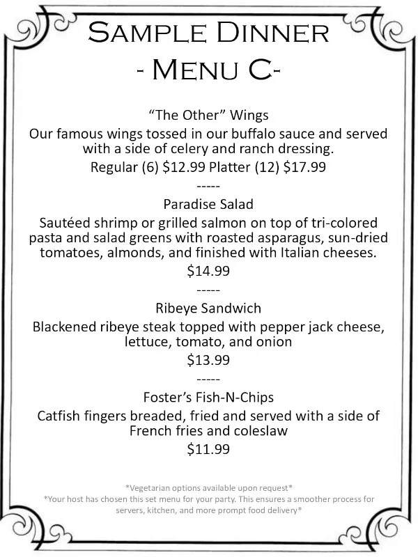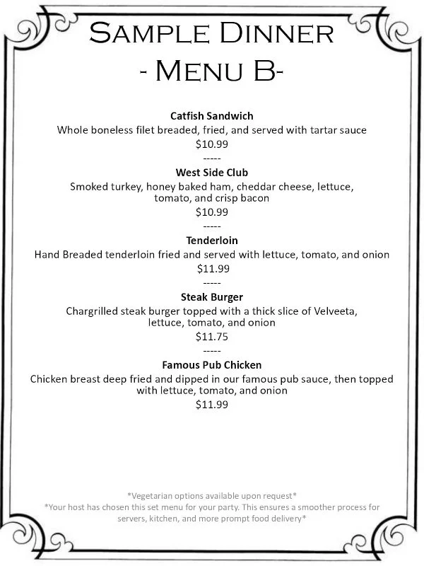 Menu selections for all parties must be arranged & finalized through management 14 days prior to the date of the function.