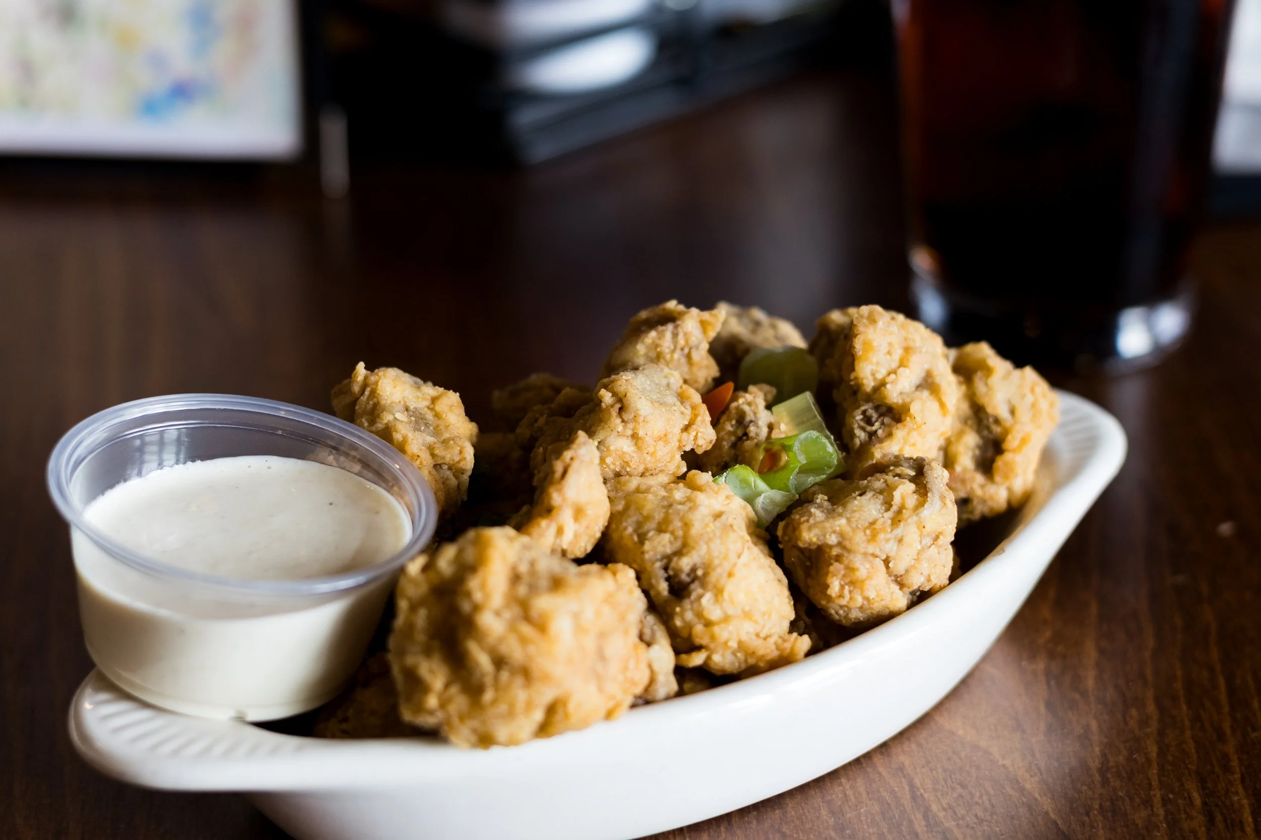 1 lb. of mushrooms, sliced in half, hand-breaded and deep-fried. Served with homemade tiger sauce.