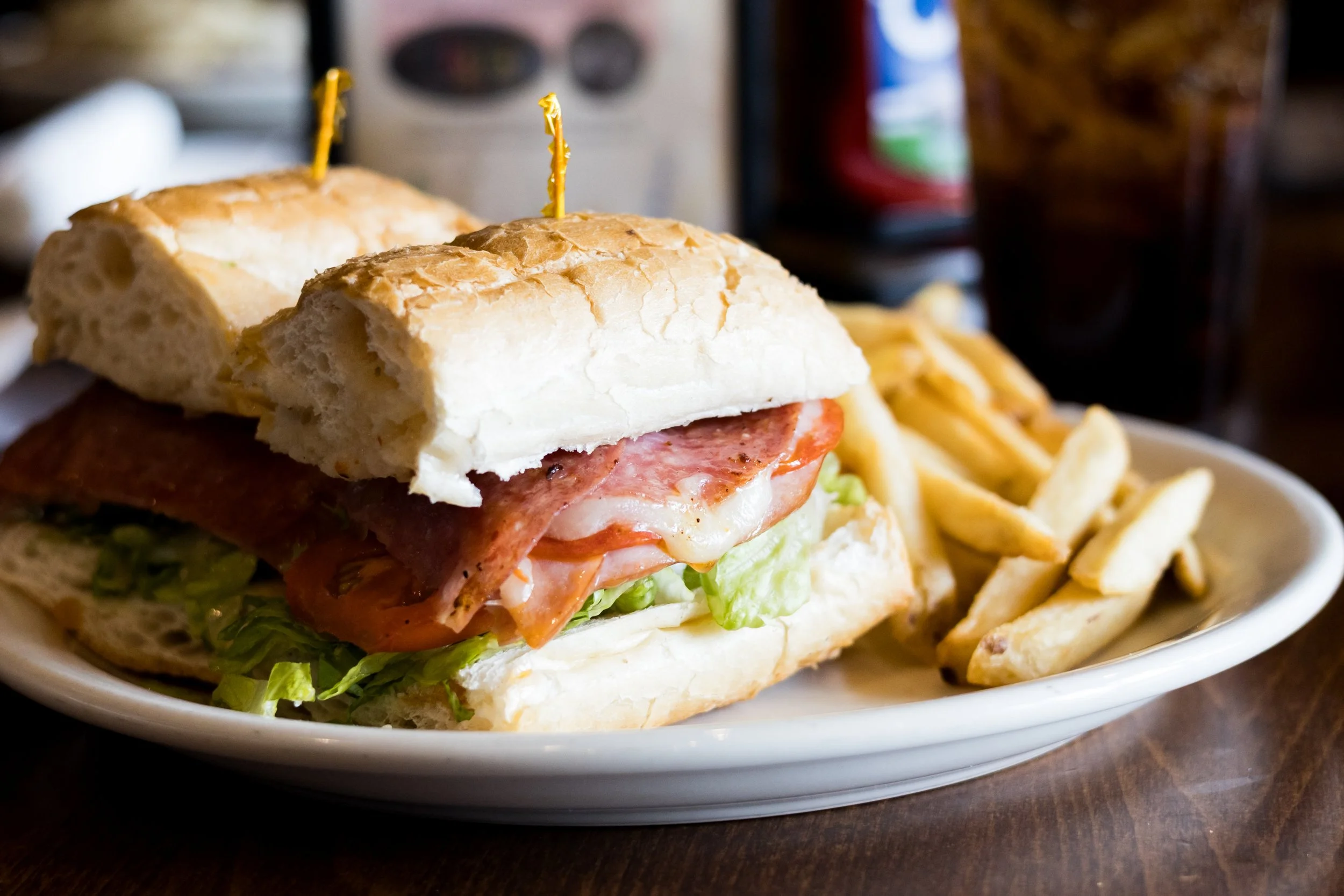 Salami, pepperoni, ham, provolone cheese, lettuce, tomato, red onion, oregano and homemade Italian dressing, toasted on a French roll.