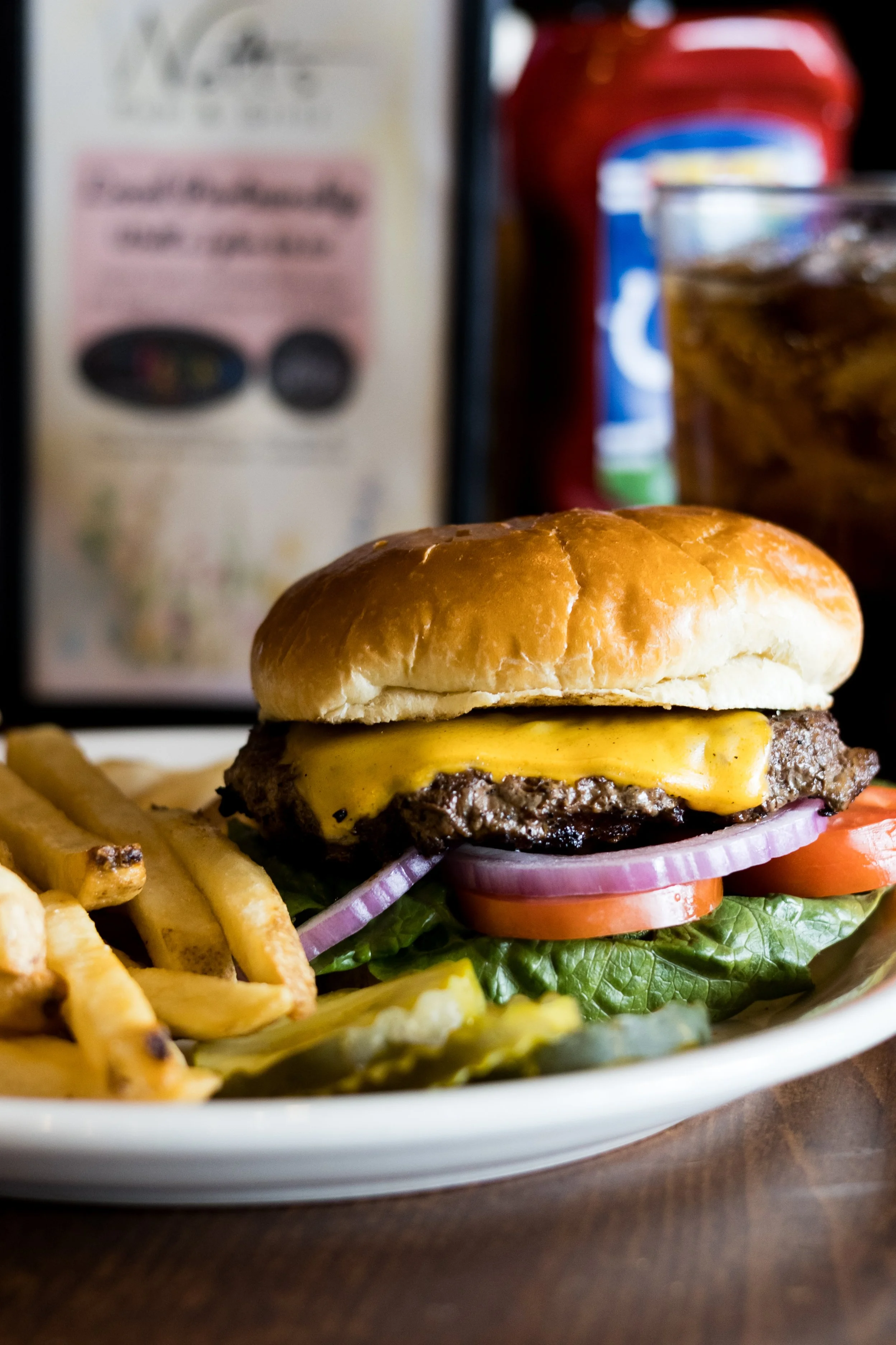 1/2 lb. hand-pattied Angus beef. Served with lettuce, tomato, onion and pickle.
